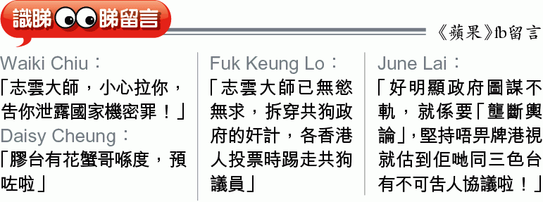 昨日《城市論壇》上,無綫前總經理陳志雲認為,政府的處理手法「即係蹺埋隻手唔參與」,擔心只餘下一間免費電視台,令無綫報道新聞變相「壟斷輿論」,影響未來的區議會、立法會及特首選舉,對新聞自由有極大損害。