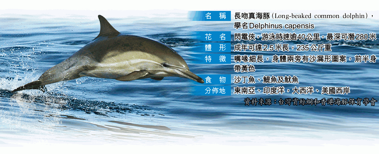 【本報訊】本港海域驚現逾300條海豚逐浪,跳躍奇景!7名釣魚發燒友前日租船出海到果洲群島垂釣,遇上海豚大軍集體逐浪跳躍壯觀場面,當時海面方圓幾十米盡是活潑海豚,在場釣友忘形大叫「幾難得見到百幾條海豚一齊跳躍游水!畀錢都睇唔到呀!」本港海豚專家據外形推斷訪港的是有「閃電俠」之稱的長吻真海豚,今次300條齊齊現身,是本港歷來最多一次。