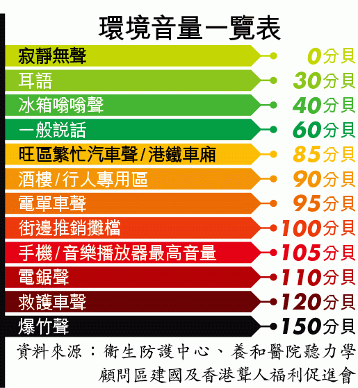 一般人的交談音量約60分貝,港鐵車廂環境雜音約80分貝,85分貝則相等於旺區街道上的汽車聲音,惟人們難以評估個人流動裝置輸出音量的分貝。區教路,將音量調校至最高輸出音量的六成最安全,兒童只應調至五成。其實平時也可做個小測試,當旁人在耳機使用者的身旁,能聽到耳機傳出的聲音,則顯示音量過高;若聽歌後感覺耳鳴不適,亦是聽力出問題的先兆。