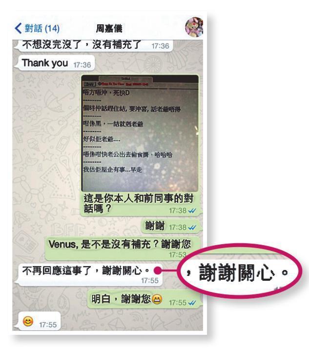 後來華華將呢張截圖傳畀周嘉儀,佢透過WhatsApp回應話:「不想沒完沒了,沒有補充了」、「不再回應這事了,謝謝關心」,但佢就冇否認呢張圖係假嘅。