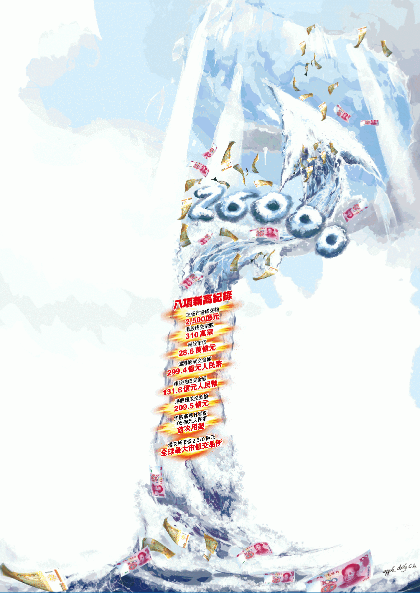 更瘋狂的是,港股主板成交額錄2,500億元,為歷來最高,平均每秒便有1,263萬元交投,盛況較97年大牛市更甚。事實上,港股昨明顯出現資金大流入迹象,如將中港股市互聯互通的滬港通去年11月起推出後五個多月來,昨日南下的港股通單日105億元人民幣額度終於首次出現用罄情況,意味內地資金正積極買入港股。