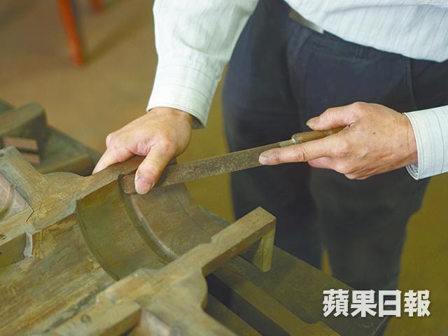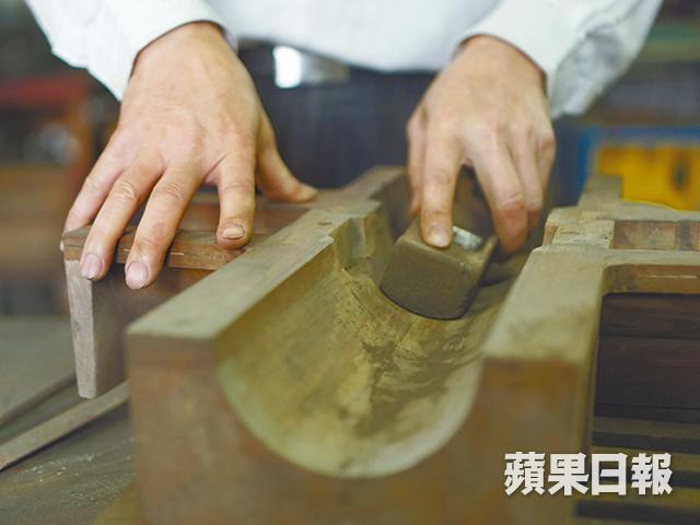 木模工藝歷史悠久,崔師傅學師時,木模工藝分廣東和上海兩派,「廣東派坐長板凳,俗稱騎馬仔,上海派有枱坐低工作,比較姿整,我兩派都用,各有長處,做喉管之類嘅組件用騎馬仔,比較細微嘅雕刻,就要坐低整。」他攤開手掌說:「𠵱家冇晒繭,一刨嘢就痛。」他在七八十年代自立門戶,那時木模製作已近黃昏,「排水行業需要嘅模具款式已經做得七七八八,當時師兄喺祥興準備退休,於是我接手,一做就十幾年。」他現在偶然仍會做木模,多數對着電腦繪圖,由十多歲做到現在六十七歲未退休,從不覺悶,一直當玩,「如果你覺得嗰樣嘢係有價值,咁就唔會覺得悶。唔掂搞到佢掂,做出嚟客人滿意,咁咪有價值囉。」