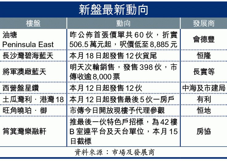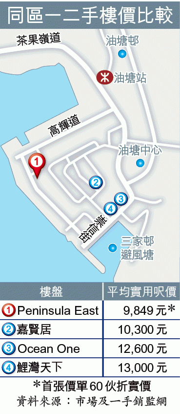 為求搶客,會德豐不惜將油塘新盤Peninsula East劈價至平過同區二手最多兩成半。首張價單60伙,兩房及三房佔比各半,面積由520至931方呎,訂價617.7萬至1,134.6萬元,呎價11,038至13,612元。