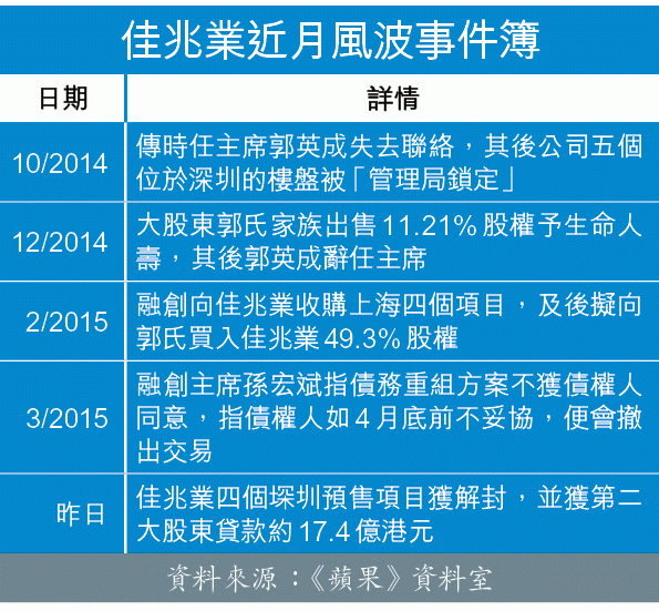 另外,佳兆業昨日又向主要股東生命人壽,抵押雙方共同持有的合資公司的當中50%股份,以換取向生命人壽借款13.77億元人民幣,為期兩年,年利率為12厘,每半年還款一次。