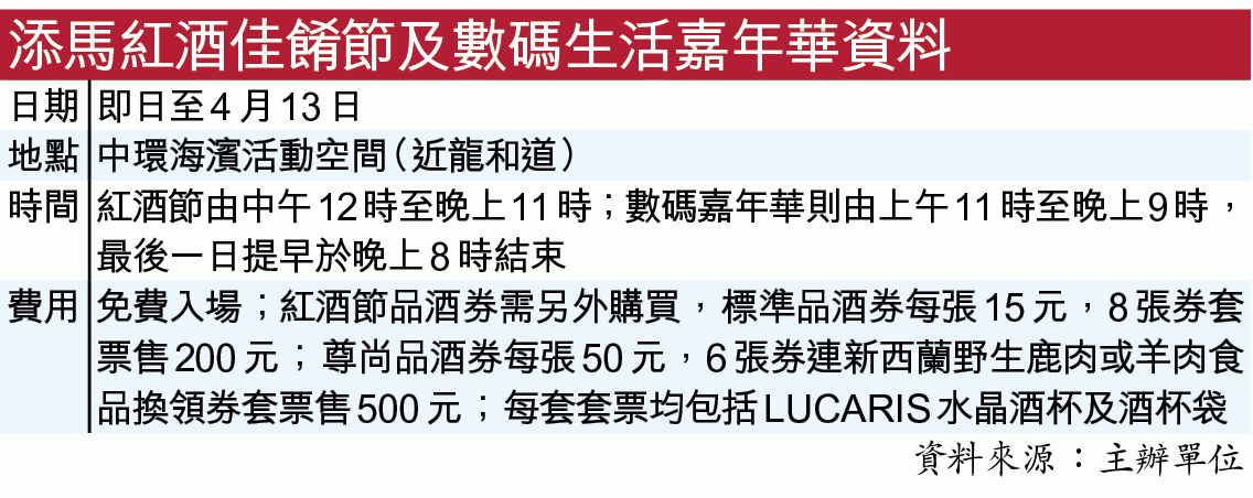 【本報訊】愛酒之人又有喜訊,首屆添馬紅酒佳餚節昨日在中環海濱開鑼,免費入場,逾100個展商引入法國波爾多100分紅酒、蒙古奶酒及意大利汽酒等,部份可另購品酒券試飲;熱炒至斷貨的日本威士忌「響」也在場內有售。同場的數碼生活嘉年華則賣大包,每日首500名入場人士可以1元購買福袋,隨時有機會獲iPhone 6及42吋LED電視等。兩個展覽料吸引30萬人次入場。