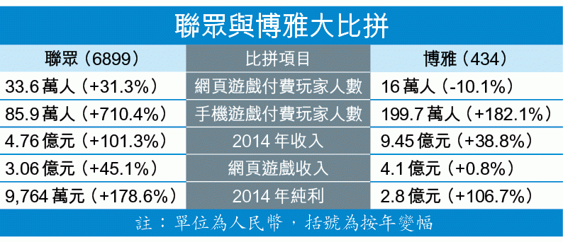聯眾指棋牌類遊戲沒有生命周期,電腦遊戲收入會繼續增長。不過,博雅將業務重心由網頁遊戲過渡至手機遊戲,去年業績顯示,其頁遊收入按年比較僅增加0.8%(見表),行政總裁張偉指,電腦遊戲收入會持續下滑,所以不再參與網頁遊戲的投資。