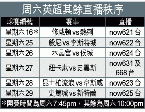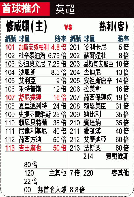 周六英超早場話題十足,由倒戈的普捷天奴領熱刺訪修咸頓。雖然修頓今役有雲耶馬停賽,但加斯安奴柏利重拾射門鞋,加上要力爭歐霸盃席位,有力擊敗近況反覆的熱刺。「讓球」修咸頓讓平/半,上盤可期。