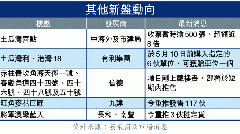 至於平同區新盤兩成的土瓜灣單幢盤喜點,收票兩日共收逾500票,較首批56伙暫超額逾7.9倍。