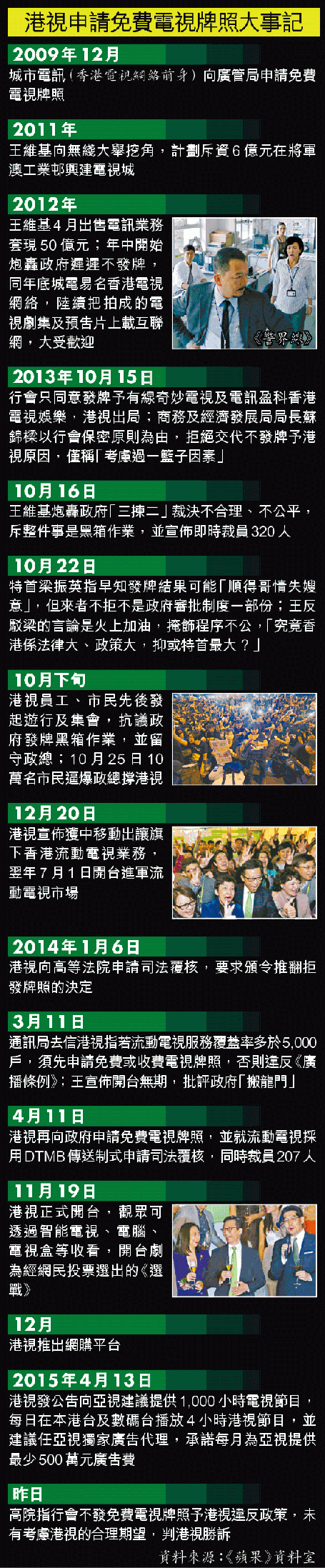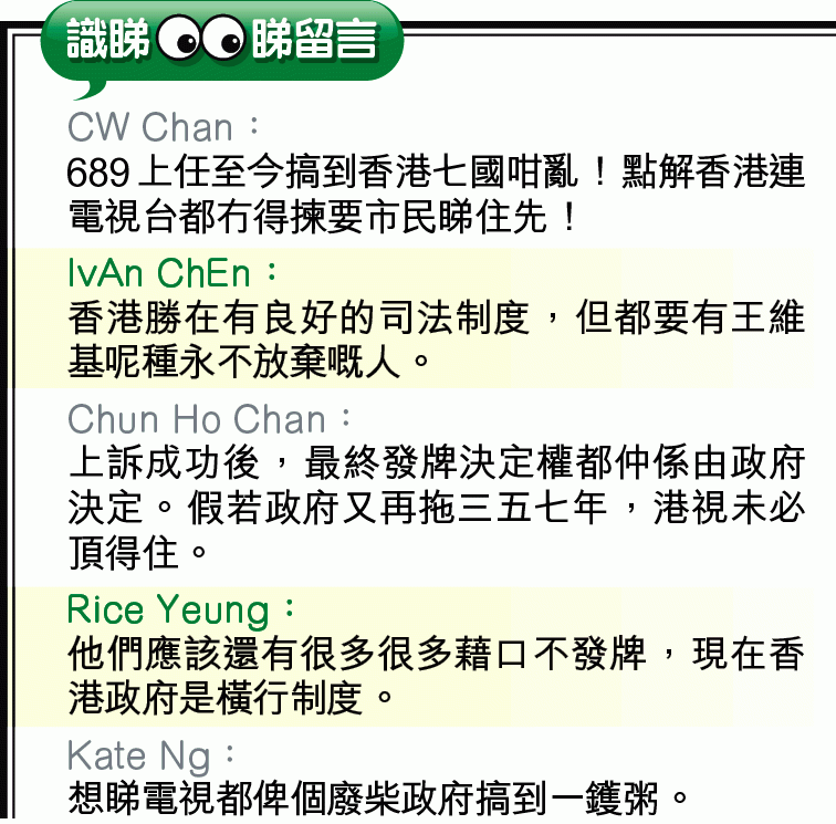 【本報訊】香港電視去年就政府的發牌決定提出司法覆核,昨日獲高院裁定勝訴。港視主席王維基昨指公司上下均對結果感興奮;曾為港視拍劇的藝人王宗堯稱,裁決反映公義仍然存在。惟也有不少前員工擔心政府仍可以拖字訣阻礙發牌,對是否可重回港視拍劇不樂觀。港視發言人稱,現階段未有計劃重新聘請員工製作新節目。