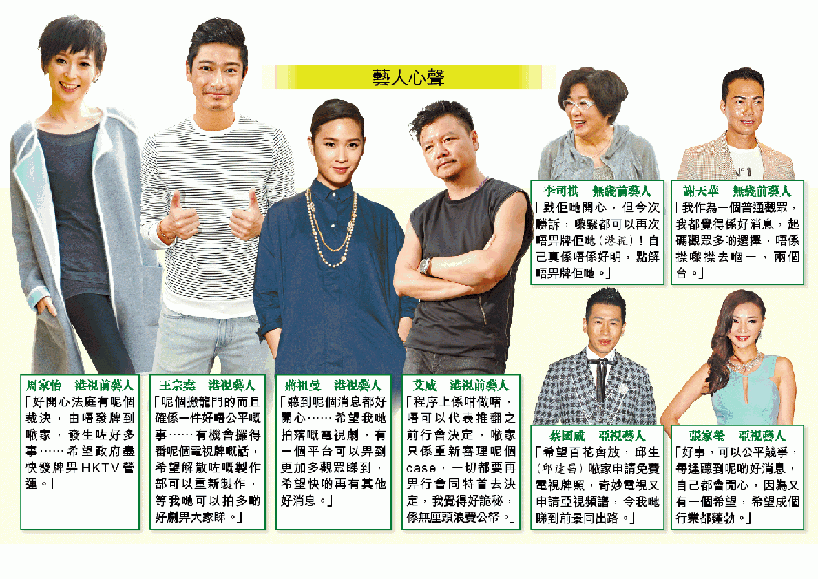 曾為港視拍劇的藝人王宗堯稱,裁決反映公義仍然存在,「呢個司法覆核可以幫到我哋手做一個申訴,起碼我哋𠵱家有一個希望,有機會推翻之前(行會)決定,有機會令到電視台(港視)入屋。」已約滿離開港視的藝人周家怡說,政府宣佈不發牌後,令港視的製作停頓,「部份員工甚至轉咗行,好可惜」,她又稱,如港視重新拍劇,「梗係會考慮再合作啦」。