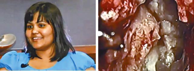26歲印度女子卡拉納(Yamini Karanam左圖)赴美國修讀博士學位,去年秋天突感到異常疲倦和頭痛,求醫後發現腦內長有腫瘤,醫生上周三為她作移除腫瘤手術時,竟發現這個腫瘤有骨骼、毛髮和牙齒,原來是個畸胎瘤(右圖)。