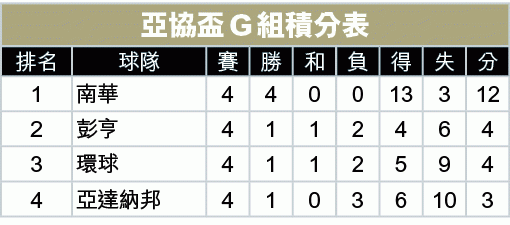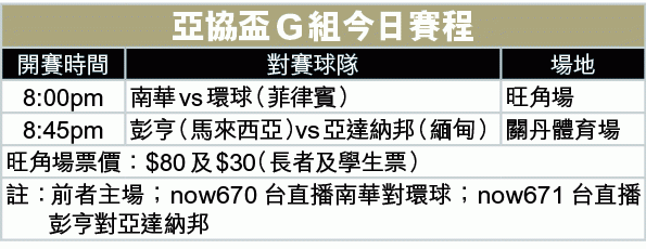 【亞協盃G組】失意於本土賽的南華,今晚八時在旺角場舉行的亞協盃G組,乘分組賽四連勝提早出線的氣勢,迎戰菲律賓環球望能再下一城,以洗一周內連失兩盃的頹風,並以勝利送別阿根廷籍教練馬里奧。(now670台今日8:00pm直播)記者:曾雁平