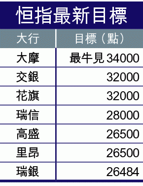 大摩將未來12個月恒指目標由26800升至30000點,H指由12500升至15000點,並料在AH股仍有差價下,內地在岸投資者仍會增持港股,最牛可見34000點,潛在升幅仍達兩成。