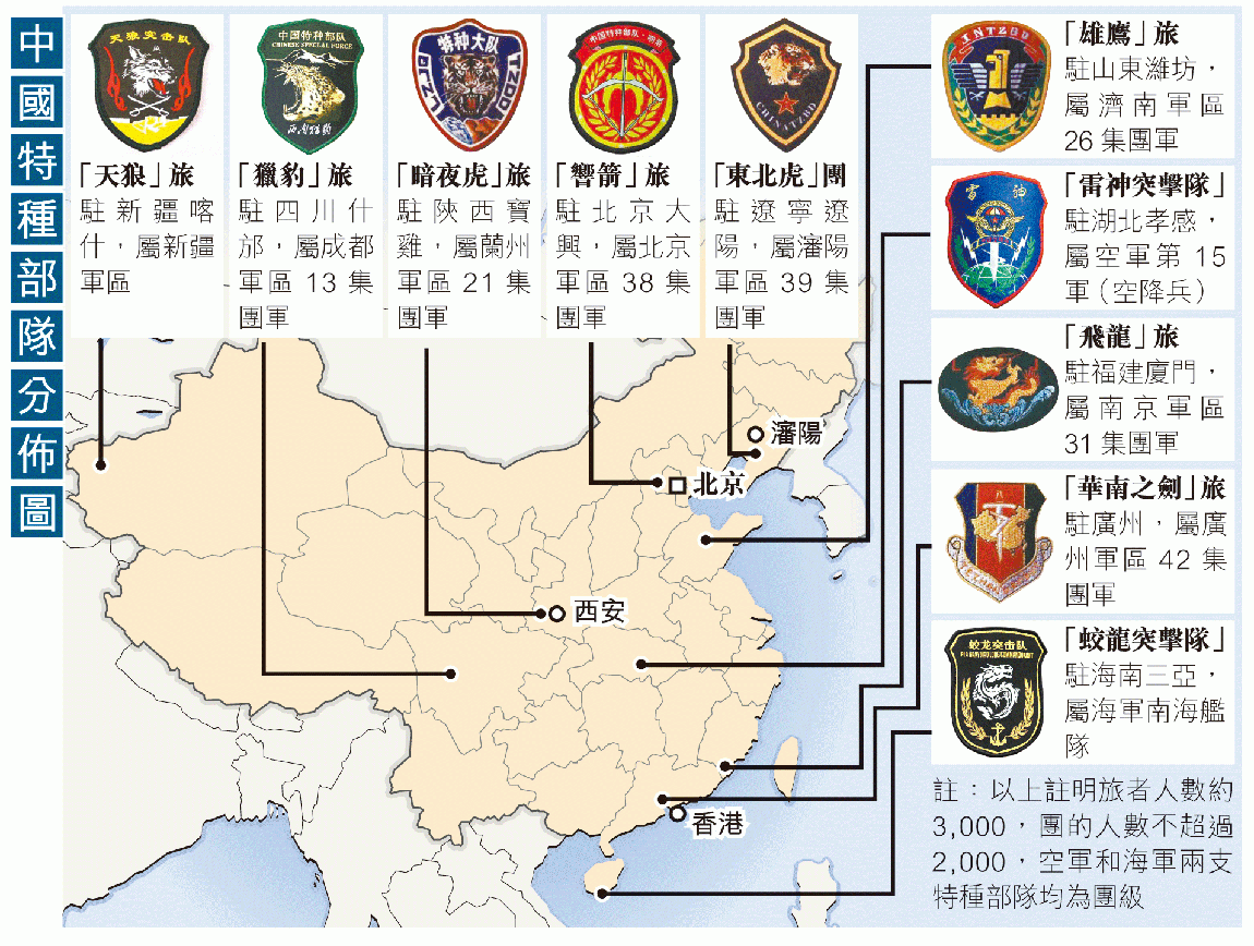 詹姆斯敦基金會網站(jamestown.org)近日發表題為「解放軍特種兵:組織、使命與訓練」文章,披露解放軍特種部隊過去10多年大幅擴編,全國18個集團軍至少一半擁有旅級特種部隊,新疆和西藏亦然,加上其他,特種兵總員約3萬人;解放軍特種部隊主要用於境外作戰,如對台或釣魚台等。但中國特種部隊仍屬初級探索階段。