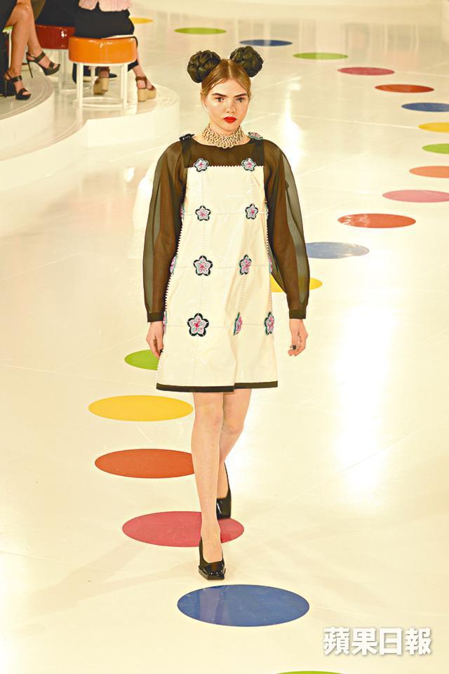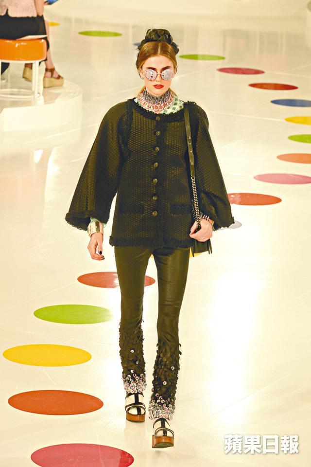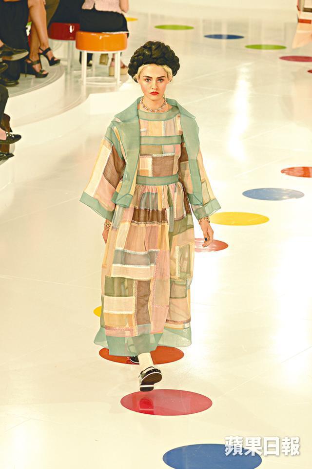 整個Paris-Seoul系列有不少彩色條子拼色patchwork dress,女模頭上更加了韓國文化代表富貴的假髮辮和大髮髻,韓國傳統特色強烈。香奈兒的tweed jacket加上企領或cutout,變成韓國獨有的K-style update版。