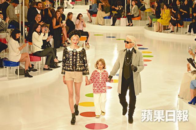 配飾也是一片韓風,大件的水晶首飾是當地的bling bling街頭文化,盒形clutch是參照傳統木衣箱,還有復古平底Mary jane二合一的sock-shoe,完騷時韓國名模朴秀珠與老佛爺及其6歲契仔Hudson Kroenig一齊拖手謝幕。
