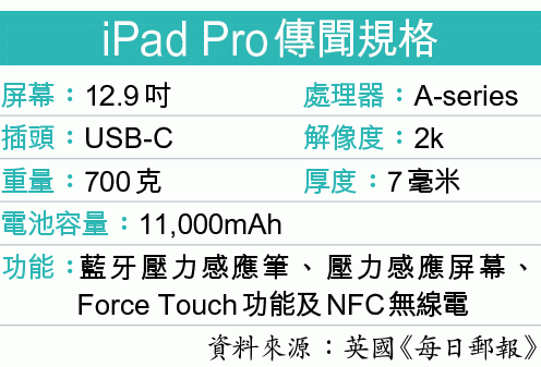 消息指,iPad Pro並會使用新一代的A-Series處理器,配備近場通訊(NFC)無線電,以支援「Apple Pay」付費功能;機身就會加設USB-C插頭,但就未知是另外加入,還是代替現有的Lightning接頭。12.9吋芒的解像度為2k,機身僅重700克,厚度為7毫米,電池容量就達11,000mAh,比現時的iPad Air 2電池用量更持久。
