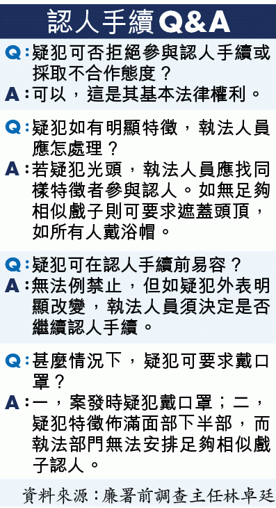 而廉署前調查主任林卓廷就表示,被捕人士的權利包括拒絕參與認人手續。若決定參與,疑犯也可要求律師或太平紳士在場。若疑犯身體有明顯特徵如光頭,有權要求與所有戲子一同戴浴帽。但他強調,一般情況下,只有在案發時疑犯戴口罩才可在認人時戴口罩,若疑犯只是留鬚,就不應讓口罩遮蓋無鬚位置如鼻子。