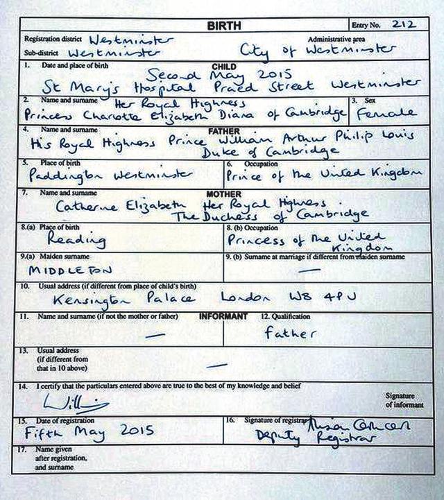 無巧不成話,夏洛特公主的表姑姐,即已故戴妃胞弟斯潘塞伯爵(Charles Spencer)的兩歲女兒,亦叫「夏洛特.戴安娜」,斯潘塞讚嘆她們共同擁有完美的名字,相信女兒會為與表親同名感到興奮。此外,凱蒂的妹妹皮帕(Pippa)也是用「夏洛特」作中間名。女皇昨日下午到了肯辛頓宮,首次探望曾孫女夏洛特,而威廉夫婦昨午亦為女兒辦理出生證明書。