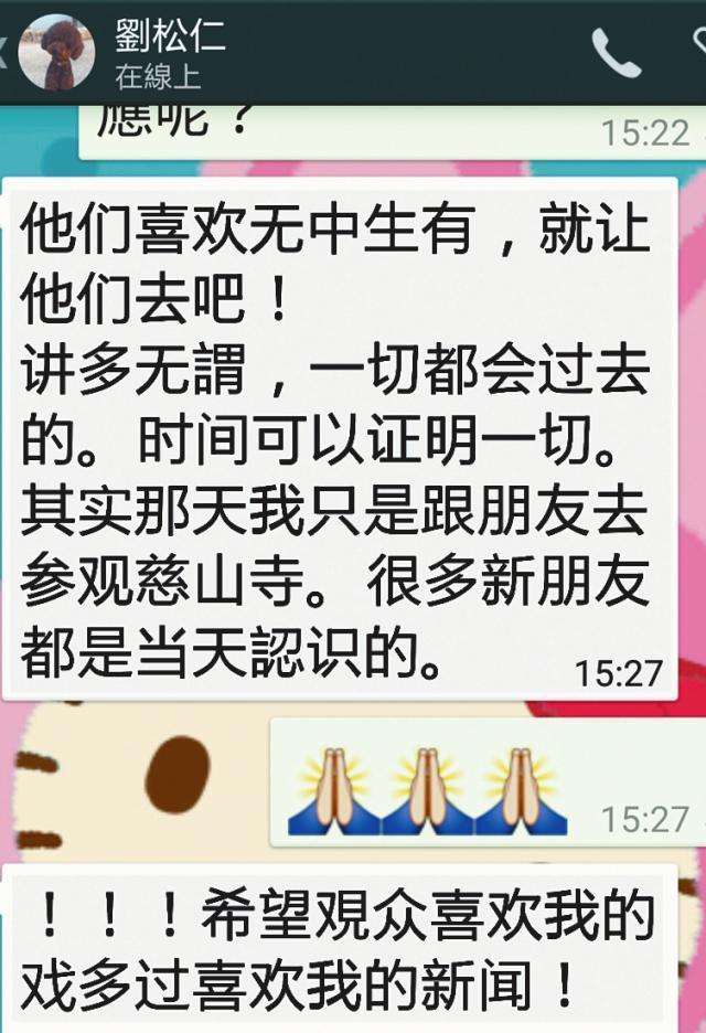 記者昨日致電松哥,他透過WhatsApp直斥報道無中生有:「他們喜歡無中生有,就讓他們去吧!講多無謂,一切都會過去的。時間可以證明一切。其實那天我只是跟朋友去參觀慈山寺。很多新朋友都是當天認識的。」之後他更補充:「希望觀眾喜歡我的戲多過喜歡我的新聞!」