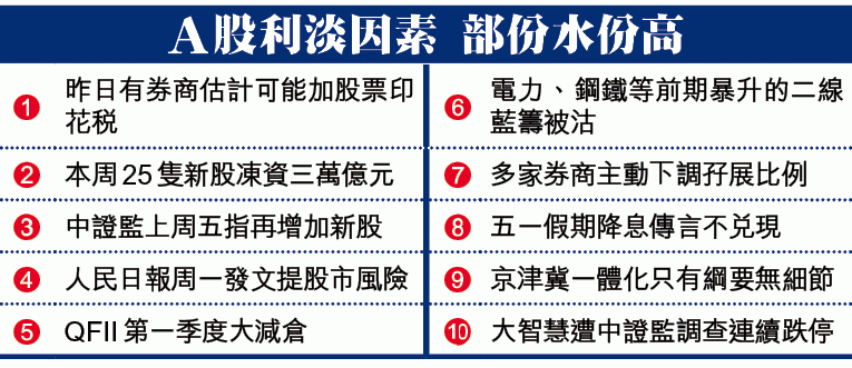 A股大跌,昨日內地網上熱傳一份「A股十大利空因素」文章,加劇市場恐慌。不過究其內容,大部份均為舊聞,較為有新意為長江證券昨日發報告指,內地第三季有可能加股票印花稅,由現時單邊徵收,改為雙邊徵收。但類似消息之前在4月23日亦曾於微博瘋傳,翌日中證監已澄清,謂是不實傳言。