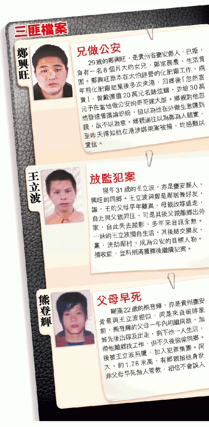 至於該案至今被捕六名綁架集團成員大部份是貴州人,其中在港落網的29歲主犯鄭興旺,與在深圳被捕的王立波(31歲)及熊登輝(22歲),均來自貴州省甕安縣,其中鄭、王且是同村兄弟,鄭因犯下綁架案,昨被家鄉人稱做「賊王」。