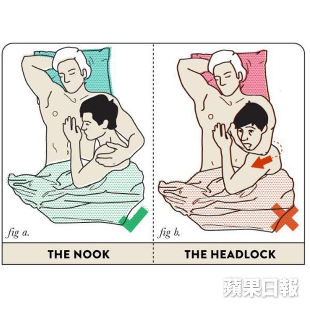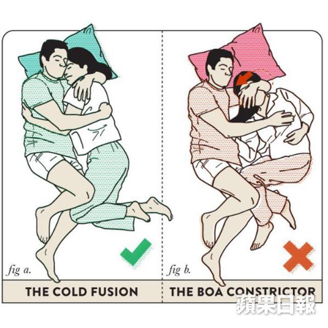 戀人安靜地一起入睡,親密自在。正值熱戀期的情侶,剛開始同睡一張床時,總有手腳不知往哪裏放的問題。不是她手肘壓住了他的臉,便是他把她推到床角動彈不得。所以說,伴侶平日再溫柔體貼,入睡後手腳不受控制,就容易洋相盡出,影響枕邊人。有外國漫畫家畫出情侶間十個最好和最壞睡覺姿勢,好好參考一下,避免睡着了也跟伴侶打架。