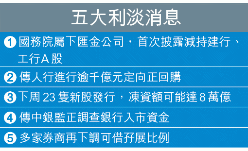 【本報訊】國家隊離場,A股爆小股災!正當滬綜指向5000點衝關之際,昨內地突然湧現多宗利淡消息。其中中央匯金公司史上首次減持內銀的消息最為震撼。內地股市昨最高見4986點,午後財經網站刊出匯金減持消息,A股隨即插水,越跌越多。