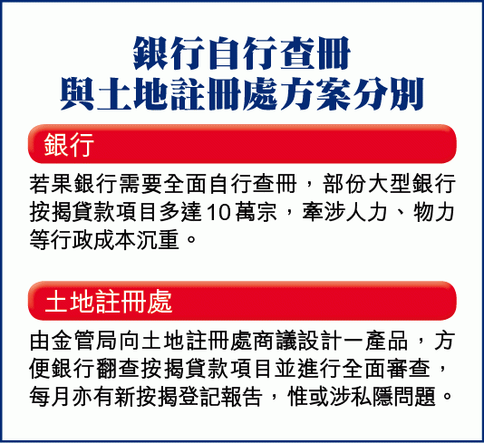 【本報訊】金管局擬與土地註冊處合作,加強對違規二按監管。該局副總裁阮國恒與傳媒茶敍時透露,除了目前抽樣調查方法,當局欲利用更全面定期查核客戶組合,包括計劃與土地註冊處籌建一個全面查核方案,方便銀行整批按揭組合核查,違規二按或全面曝光。