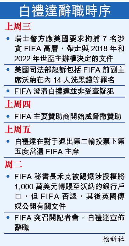 國際足協(Fédération Internationale de Football Association, FIFA)上周爆出歷來最大貪污醜聞,主席白禮達(Sepp Blatter)力拒下台呼聲,上周五第四度連任,前晚卻突然宣佈辭職,令全世界意外,也令人狐疑他究竟發生了甚麼事情而轉軚。傳媒指白禮達已成美國的FIFA貪污案調查目標,加上頭號心腹捲入南非世界盃賄賂醜聞,令他的態度在前後四日之間,出現180度轉變。
