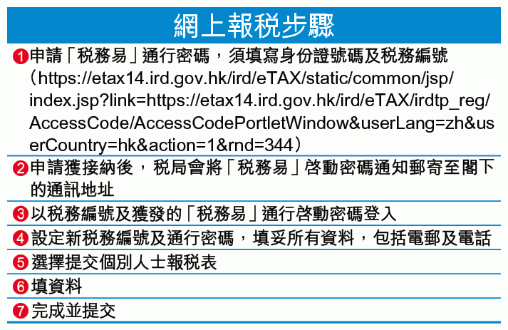 網上報稅所填寫的資料基本上與實體報稅無異,強積金僱員強制性供款、慈善捐款及與工作有關的進修課程可作稅務減免外,長者住宿照顧開支亦可扣稅,上限為8萬元。
