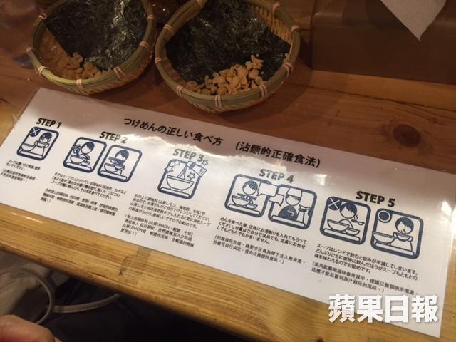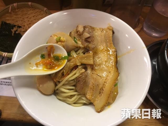 枱上有清楚食法說明,店員先放上紫菜及脆粒,備有七味粉、芥辣檸檬汁及櫻花蝦醋等醬料。湯和沾麵分開上桌,要將湯內的配料放在沾麵上吃,長形的叉燒先用火槍逼出油份再加上微焦的香味,肥美適中。湯汁蝦味頗濃,但頗油膩,麵質頗硬,最欣賞反而是份量頗多的櫻花蝦。吃到最後可選擇加湯,不過仍較油膩。