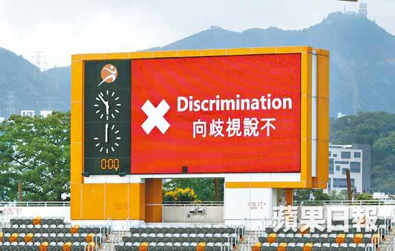 旺角場大屏幕賽前有顯示「向歧視說不」標語,而足總發言人解釋,其實過去舉行國際賽都有播出這些標語,加上港隊早前友賽菲律賓,因球迷行為不檢而遭國際足協罰款,故播出標語屬提醒球迷性質,與近期的海報事件無關。
