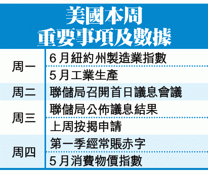 【本報綜合報道】美國聯儲局本周議息,料按兵不動,市場聚焦主席耶倫會後記者會,會否就何時加息作出較清晰的提示。另方面,本周數據不多,5月通脹和工業生產較受注視。