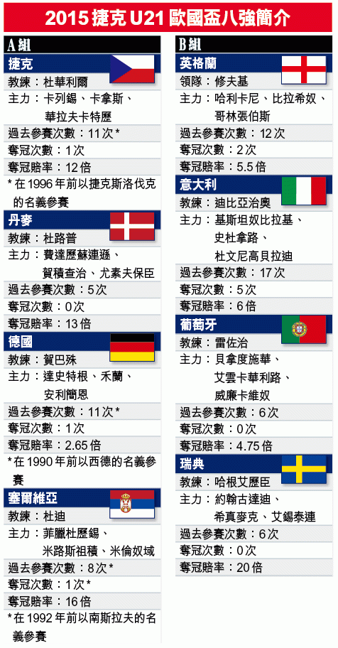 儘管德國U20在今屆世青盃八強出局,不過德國人今夏仍有機會揚威球壇,皆因其U21兵團以最強人腳,出戰在周三開鑼的U21歐國盃決賽周,有望力壓其他七支對手,繼2009年後再次封王。要阻止德國U21統領歐洲,相信只有哈利卡尼及丹尼艾格斯等壓陣的英格蘭U21有能力做到。