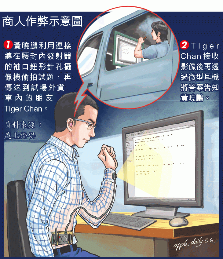 持香港身份證的被告黃曉鵬(28歲),其父為內地富商黃炳文,從事印刷業務。助理海事監督譚潤枝供稱,前年11月22日在海港政府大樓3樓,監考俗稱遊艇牌的「遊樂船隻操作人合格證明書」考試,開考後數分鐘即發現答了一條題目的被告的左邊衫袖口有異樣,有疑似鏡頭物體,遂將他帶離試場到另一房間查問。