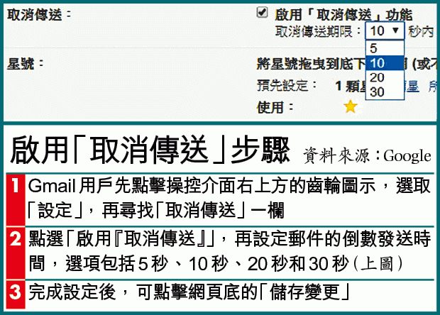 所謂取消傳送,並非真的能夠取消已寄到別人郵箱的郵件,而只是延遲送出電郵。想啟用這項新功能,Gmail用戶要自行在「設定」一欄,點擊「取消傳送」,之後便可設定倒數寄出時間,選項包括5秒、10秒、20秒,最長可達30秒,相信時間足夠用戶三思。