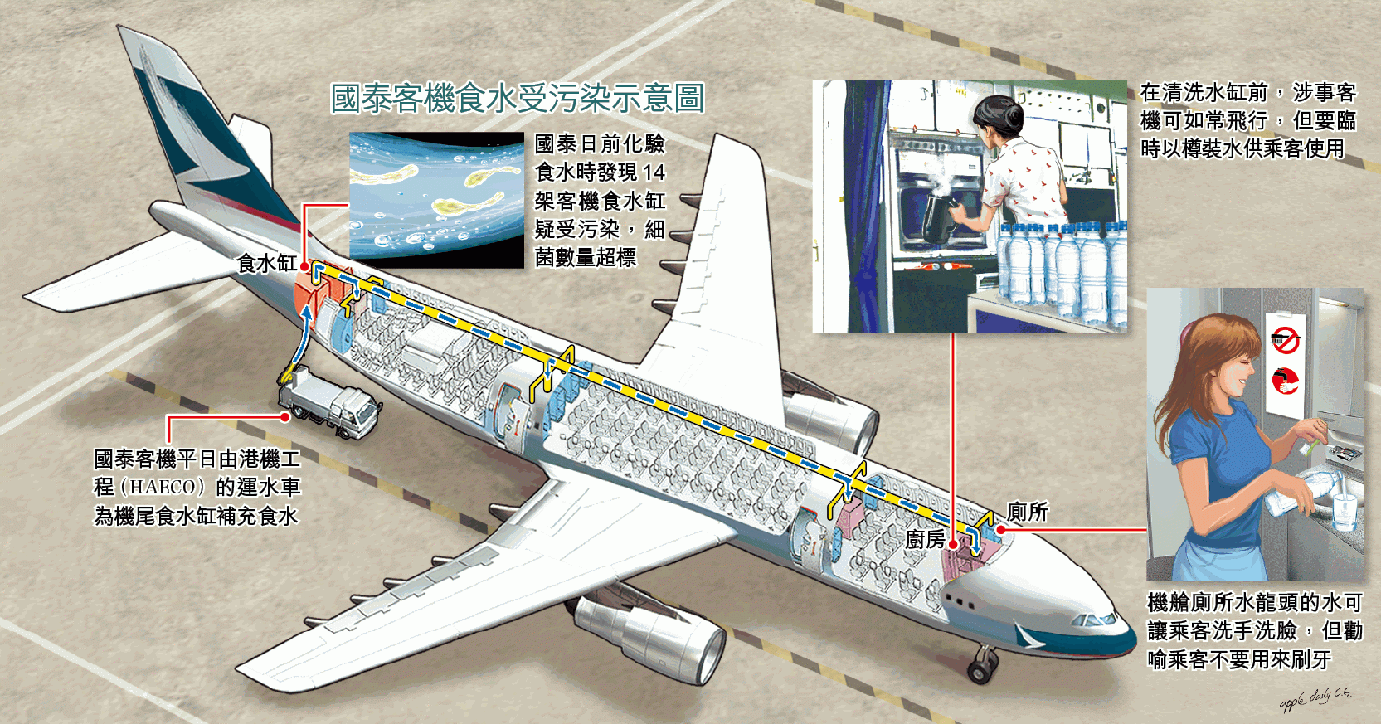 由於航機食水缸細菌超標,令供應熱水、茶及咖啡變得極難,空姐工作量大增,部份航機更暫停供應熱水。今次涉事客機共14架,佔國泰機隊146架客機約一成,當中包括五架波音777客機及五架空中巴士A330型,部份是機齡僅一兩年的新機。