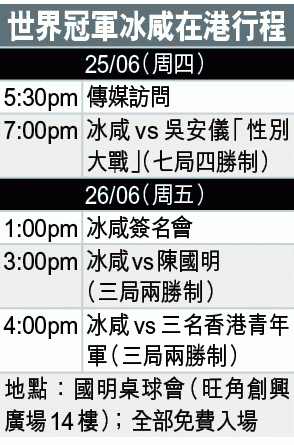 冰咸今次趁上星期到無錫參加世界盃桌球隊際賽後,來港出席桌球交流活動,之後再去澳洲比賽;他在香港兩天,會跟球迷簽名,又會與香港青年軍交手(見附表)。