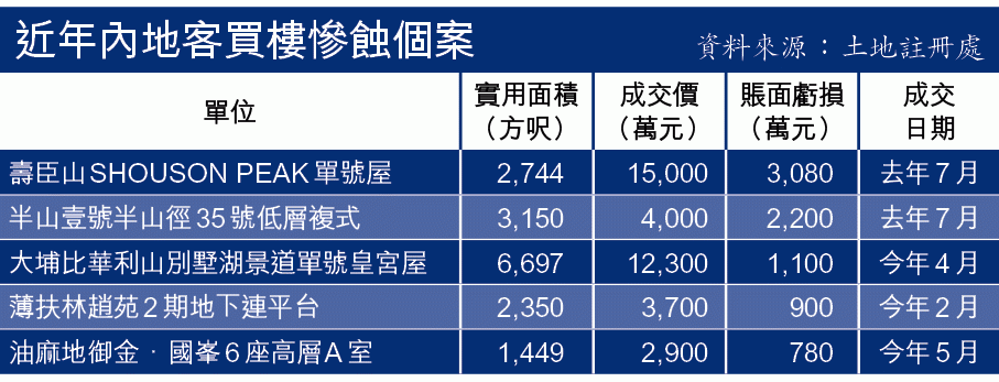 過去1年內,豪宅錄多宗蝕讓,其中「五大血案」全由內地客包辦。當中港島壽臣山洋房SHOUSON PEAK成蝕讓王,內地客沽貨勁蝕逾3,000萬元;九龍蝕讓王則為何文田半山壹號,有複式戶勁蝕2,200萬元。大埔比華利山別墅再錄蝕讓,銀池道雙號屋,實用2,820方呎,剛售3,500萬元,連使費蝕近200萬元。