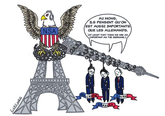 維基解密公開的「最高機密」文件顯示,美國在2006到2012年間,監控了三任法國總統,即希拉克(Jacques Chirac)、薩爾科齊(Nicolas Sarkozy)和奧朗德的通訊。其中奧朗德被美國情報人員得悉他除了非常擔心希臘脫離歐元區外,更被發現在履新幾日就背住德國總理默克爾接觸德國反對派(詳見附表)。