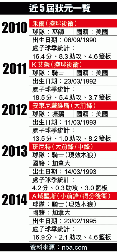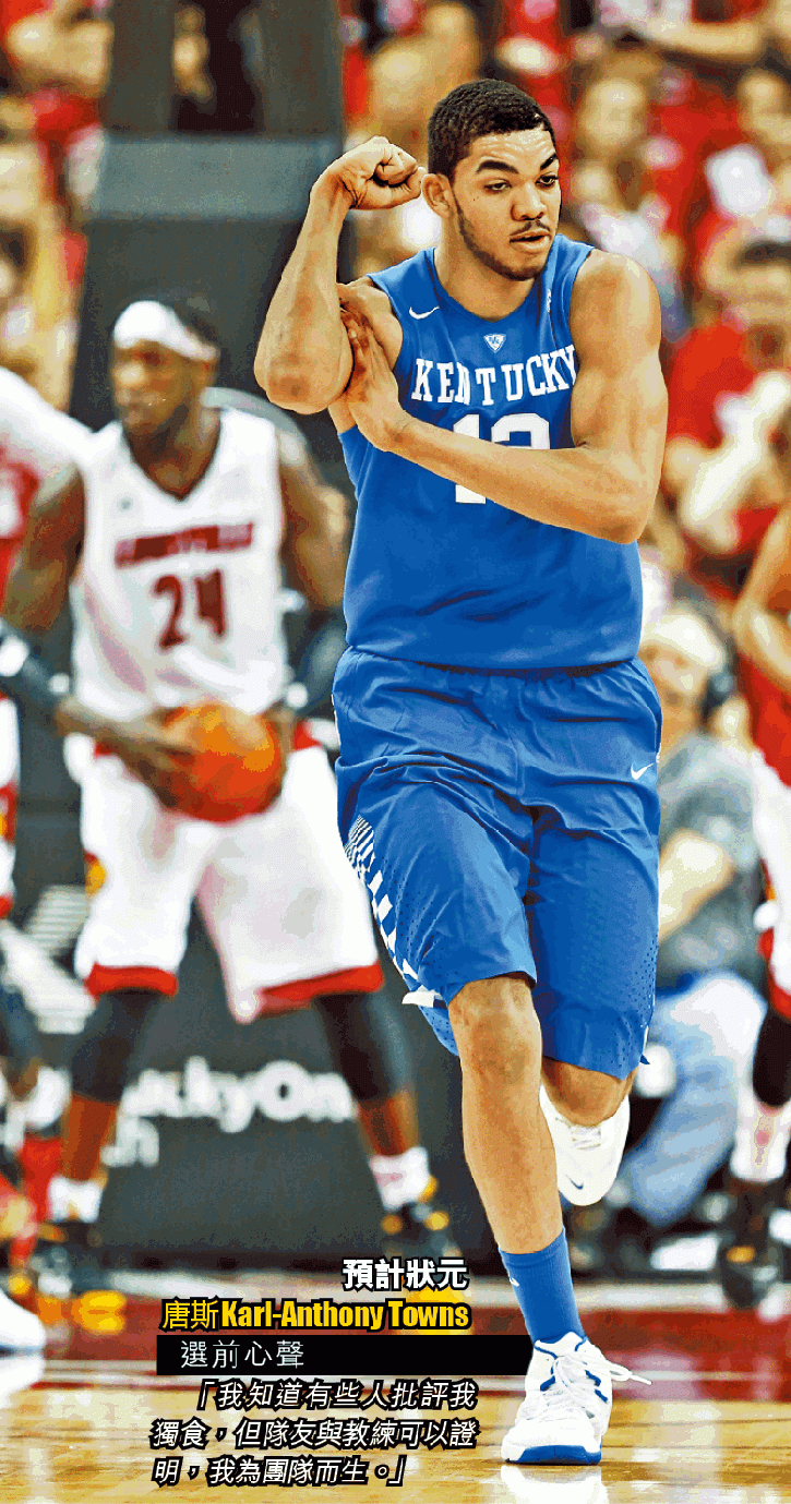 身高七呎、體重250磅的唐斯,球探將他定位為「新拜林」,與這位前湖人中鋒一樣,既擁有噸位,亦有上佳活動能力,更勝拜林是唐斯擁有外投能力。手執狀元籤的木狼,中鋒比高域(Nikola Pekovic)年紀不輕加上傷患纏身,挑選唐斯,加上A域堅斯(Andrew Wiggins)、盧比奧(Ricky Rubio)等好手,絕對令人期待。但木狼處於苦寒之地明尼蘇達,「入樽王」拿維(Zach LaVine)上年選秀大會上,得知自己加盟木狼,便即時爆粗。幸好肯大教練卡利柏拉表示,愛將十分喜歡明尼蘇達,已經準備好加盟木狼,並希望成為球會傳奇,木狼管理層也鬆一口氣。
