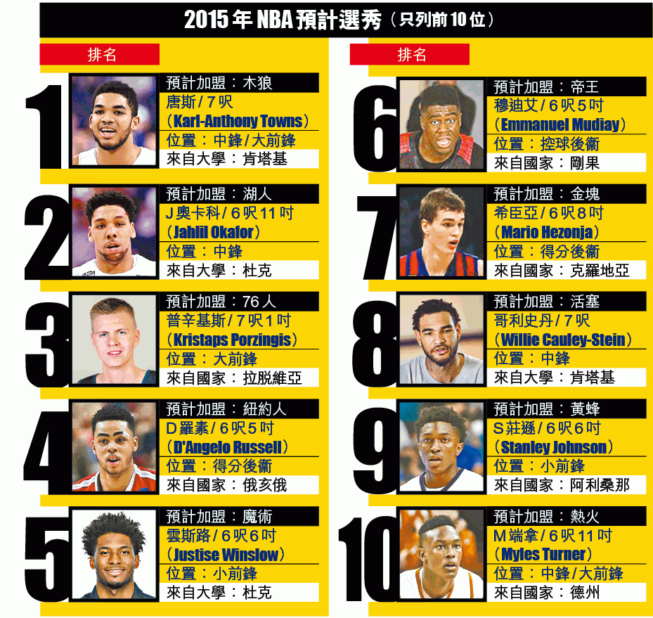 勇士以小球陣容拿下今季總冠軍,NBA仍會吹一陣子小球風;但今年在紐約舉行的選秀卻是長人天下,唐斯(Karl-Anthony Towns)及J奧卡科(Jahlil Okafor)都是狀元榜眼不二之選,甚至連「新奴域斯基」普辛基斯(Kristaps Porzingis)也可能升上探花,高佬大有機會包辦頭三位。(now635台明日7:30am直播)