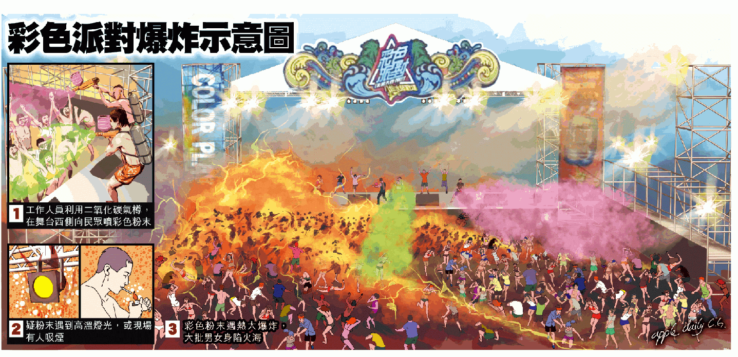 「當時以為是特效,但火越來越快,才反應過來是失火了,被火追着跑。」一名死裏逃生的參加者憶述,爆炸發生時不少人以為是特效,仍待在原地繼續跳舞,直至現場傳來此起彼落的呼叫聲,才發覺大禍臨頭。他看見所有人拚命往後跑,不少人皮都被燒起來,全身發抖,而該名參加者逃過一劫沒有大礙。有指工作人員在爆炸後繼續噴粉末,疑藉此滅火,不料反而增強火勢。