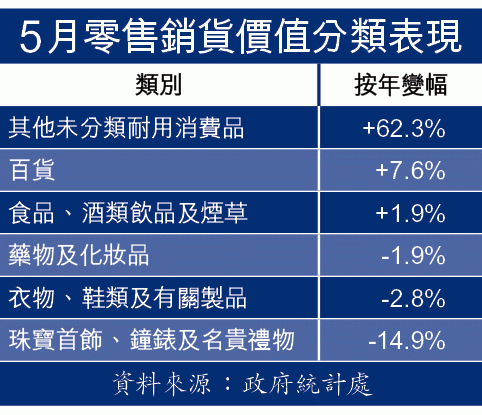 至於已連續大跌多月的珠寶首飾、鐘錶及名貴禮物,5月表現稍有起色,由早前生意跌逾兩成,到5月跌幅收窄至14.9%。而抗跌力較強的藥物及化妝品,銷售仍跌1.9%,服裝鞋履生意則減少2.8%。