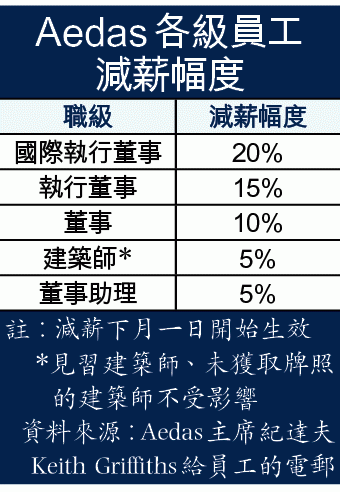 據了解,Aedas員工減薪幅度由5至20%不等,當中註冊建築師平均減薪約5%,國際執行董事減薪幅度最高達20%。不過,有資深建築師透露,Aedas員工除了要減薪,更會裁員約100人。消息指Aedas屬跨國性建築師行,公司的建築設計項目包括內地、東南亞等地,但自今年2月開始,內地經濟放緩,「內地好多項目突然煞停,現金流周轉唔到,為咗止血要減薪,仲要裁員」。業界又透露,雖然香港仍有大量工程,但早兩、三年高薪挖角潮已消失,「之前好多建築師行返咗內地搞,𠵱家受大陸拖累冇工開,好多返嚟香港搶job,建築師唔會好似前幾年咁好景,一挖角就加兩、三成人工」。
