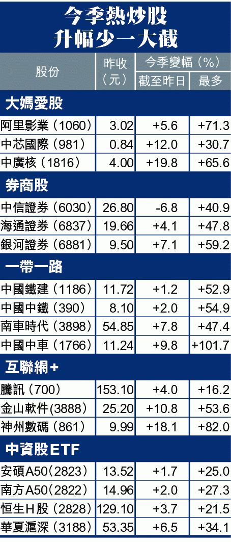 大市面臨打回原形之際,多隻熱炒股升幅已近蒸發,今季一度累飆六成的銀河證券(6881),現時升幅只餘下7%,中信證券(6030)更由四成升幅,變成目前倒跌6.8%;曾被封為神車的一帶一路概念股中車(1766),今季雖然仍累升9.8%,但相較高峯時逾倍升幅已大收縮;交投活躍的安碩A50(2823)今季升幅由高峯25%,急縮至目前1.7%。另外,港股通熱門股如阿里影業(1060)、中芯國際(981),累積升幅亦收窄至5.6%及12%(見表)。