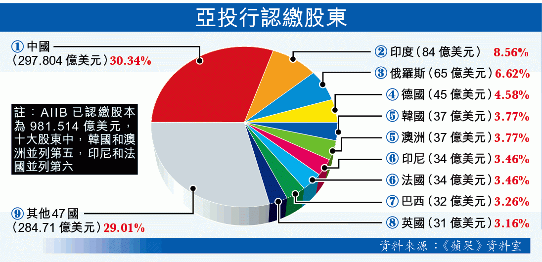 昨簽署的協定內容涉亞投行成員資格、股本、投票權、業務運營、治理結構等重大問題。亞投行法定股本1,000億,目前總認繳981.514億,原因是個別國家未能足額認繳法定股本;中方認繳額為297.804億,佔總股本30.34%,投票權為26.06%。亞投行表決政策需75%投票權同意,這意味即使其他成員全都通過也只有73.94%,換言之,中國擁有一票否決權。