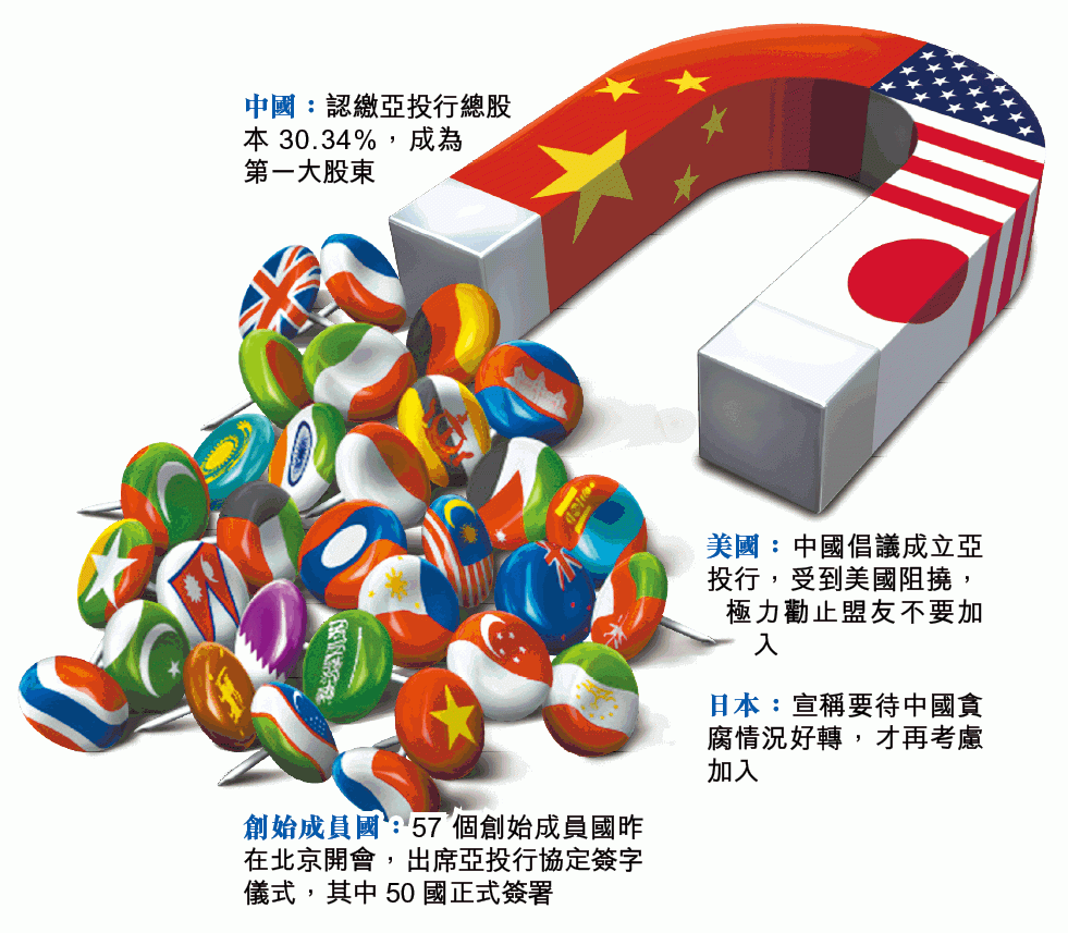 亞洲基礎設施投資銀行(簡稱亞投行,AIIB)57個創始成員國昨在北京開會,出席亞投行協定簽字儀式,其中50國正式簽署,另7國因國內程序或其他原因有待簽署。協定透露,中國認繳總股本30.34%,數額為297.804億美元(下同,約2,308.68億港幣,為第一大股東,擁有一票否決權。協定規定,亞投行總部在北京,設1名行長、若干副行長和12名董事;理事會用「多數方式」決策。