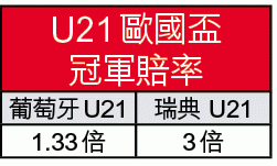 U21歐國盃周二上演決賽,葡萄牙U21雖然牌面上稍勝瑞典U21,但後者今屆越踢越有信心,加上對賽成績亦佔優,故有力於法定時間內保不敗,必捧瑞典[+1]「主勝」。